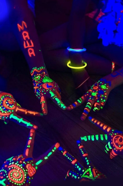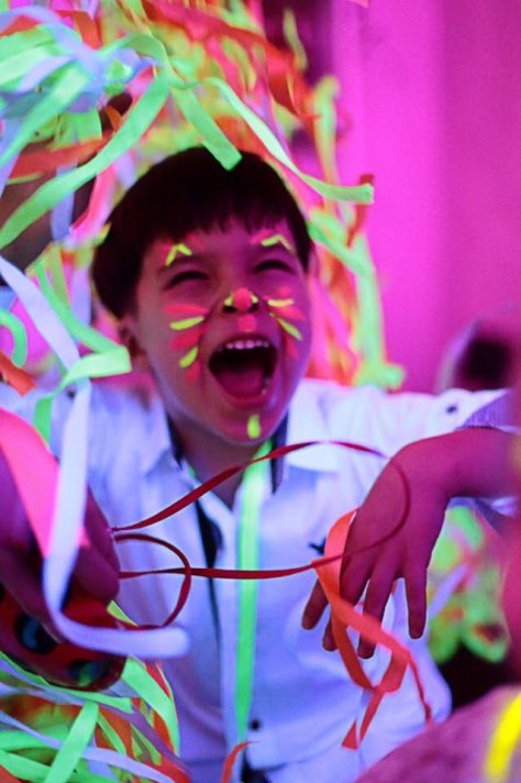 Неоновая дискотека – это веселый праздник, на котором используется неоновое освещение для создания ярких и необычных эффектов. А дети разукрашивают себя светящимся гримом. И делают это самозабвенно и от души. Прибавьте к этому фейерверк из светящейся бумаги - яркие эмоции обеспечены.